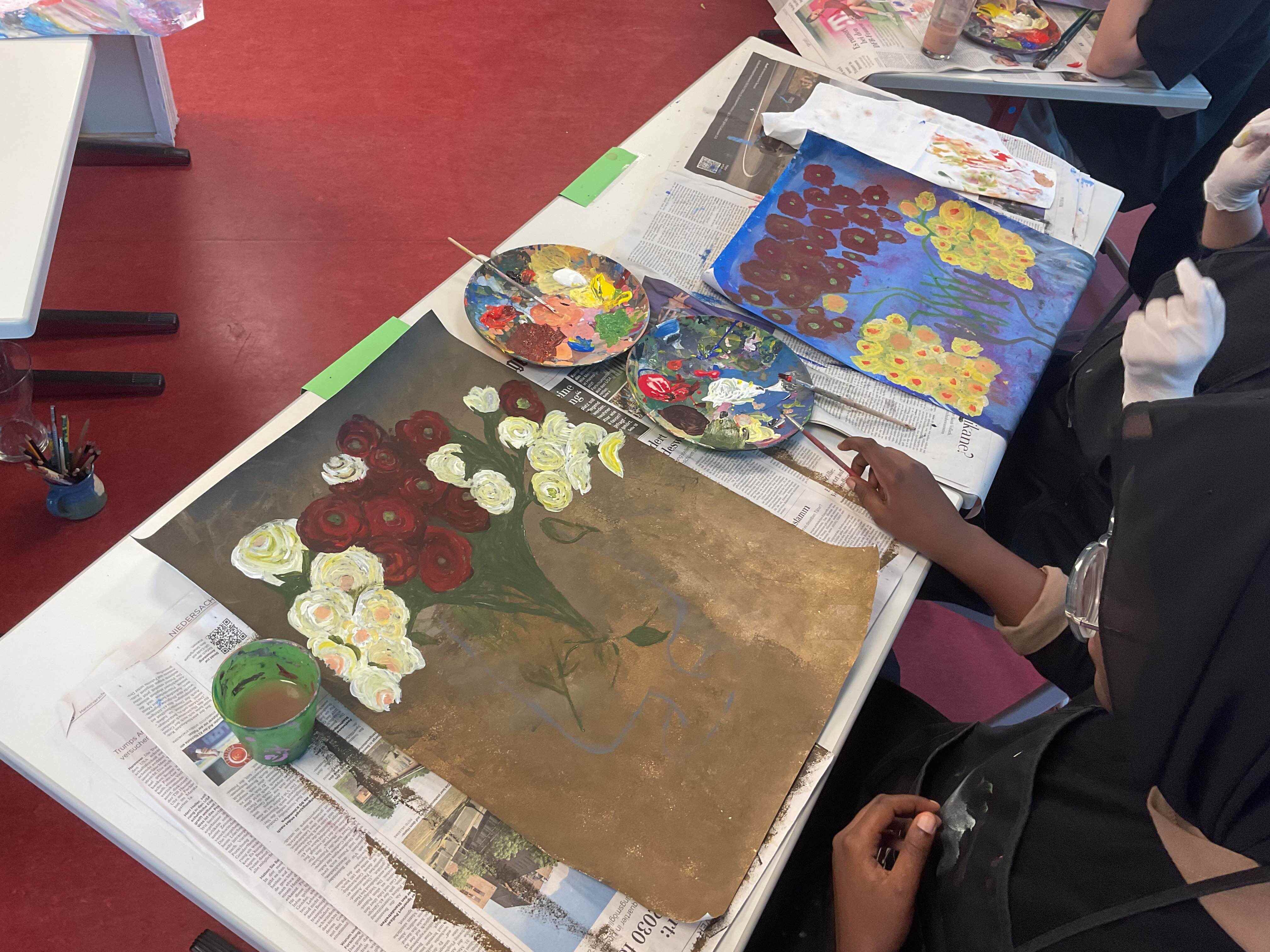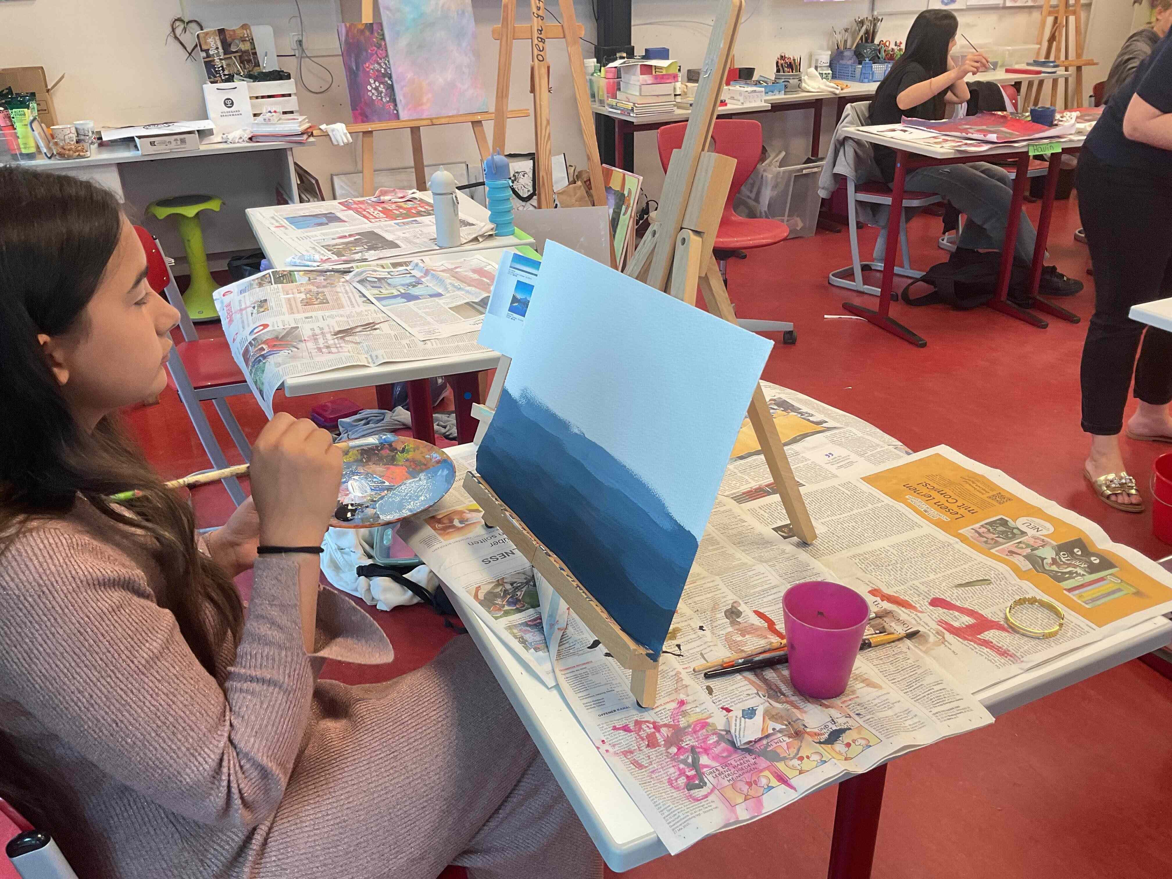 Das Projekt „Kunstwerkstatt: Fantasie", geleitet von Frau Geft, bezieht sich auf das Zeichnen und Malen. Alle Klassen dürfen daran teilnehmen. Zuerst wärmen sie sich mit Zeichenübungen auf. In der Woche lernen sie das Zeichnen mit Bleistiften, Kreide, Aquarellfarben und Acrylfarben kennen. Am Anfang zeigt Frau Geft, was die Schülerinnen und Schüler zeichnen sollen und am Ende dürfen sie ein Bild ihrer Wahl auf einer Leinwand malen.