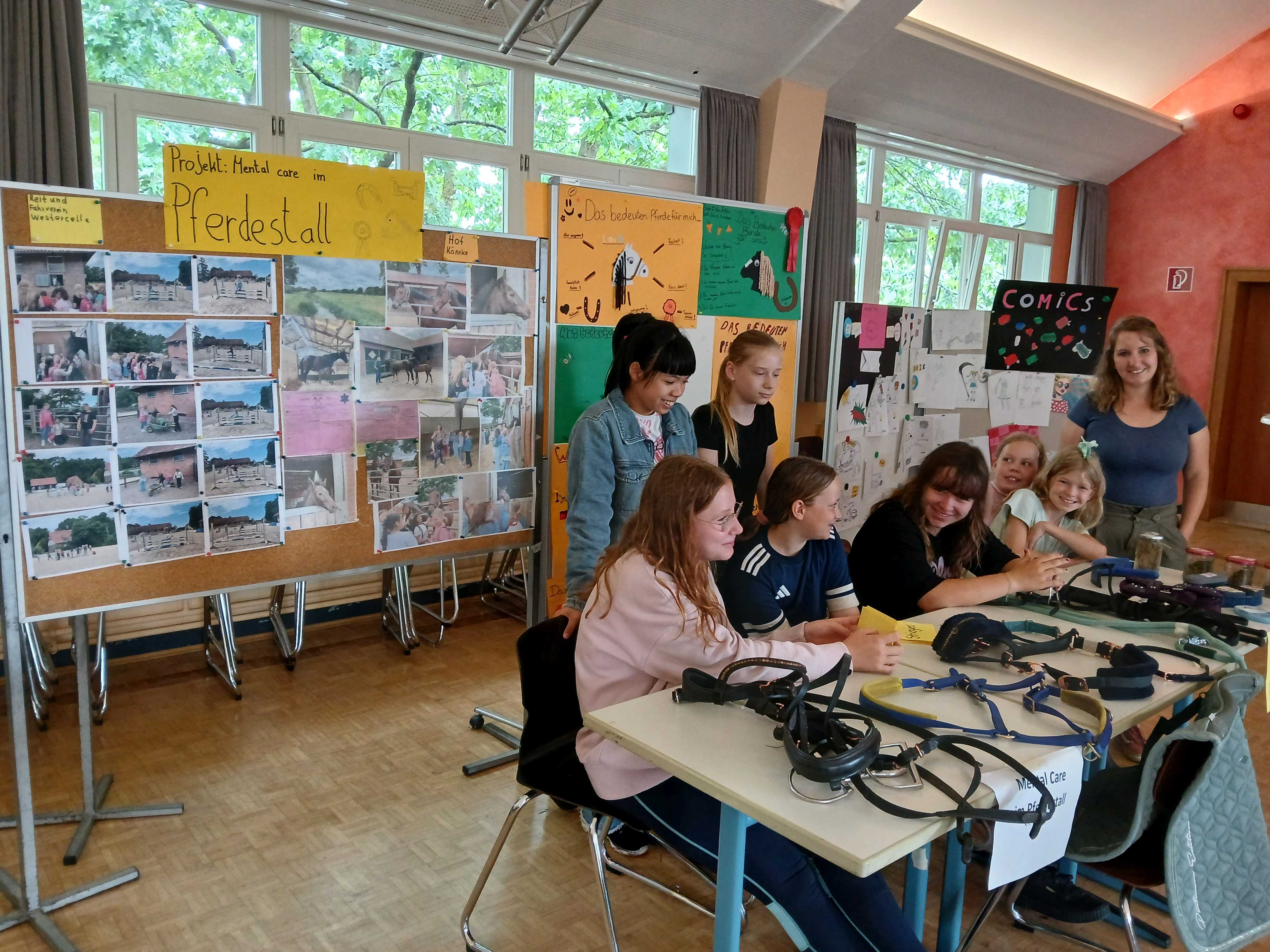 Das Projekt „Mental Care im Pferdestall- Entspannen mit Pferden" geleitet von Frau Jäger-Klein und Frau Schrader bezieht sich auf Pferde und wie man mit ihnen entspannen kann. Das Projekt ist nur für Schüler der 5. und 6. Klassen. Am ersten Tag besprechen sie, was Pferde eigentlich den Kindern bedeuten, wie und wo man mit ihnen entspannen kann und welchen Bezug sie zu Pferden haben. Dazu erstellen sie ein Plakat und Basteln einen Pferdekopf. Die restlichen Tage werden mit Ausflügen gefüllt. Sie fahren ins Landgestüt, damit sie die Pferdezucht kennenlernen, nach Nienhagen zu einem aktiven Stall und gucken sich Springreiten im Reit-und Fahrverein Westercelle- Altencelle an. Das Ziel für die Woche ist, zu lernen, wie man mit Pferden entspannen kann.