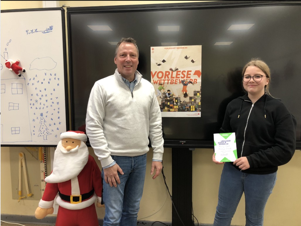 Am Ende überzeugte Amelie Egert aus der 6G1 mit ihrer guten Lesetechnik und wurde durch unseren Schulleiter, Herrn Krüger, zur Schulsiegerin des Vorlesewettbewerbs gekürt. Wir gratulieren ganz herzlich und wünschen viel Erfolg beim Stadt- und Kreisentscheid im Februar 2026!