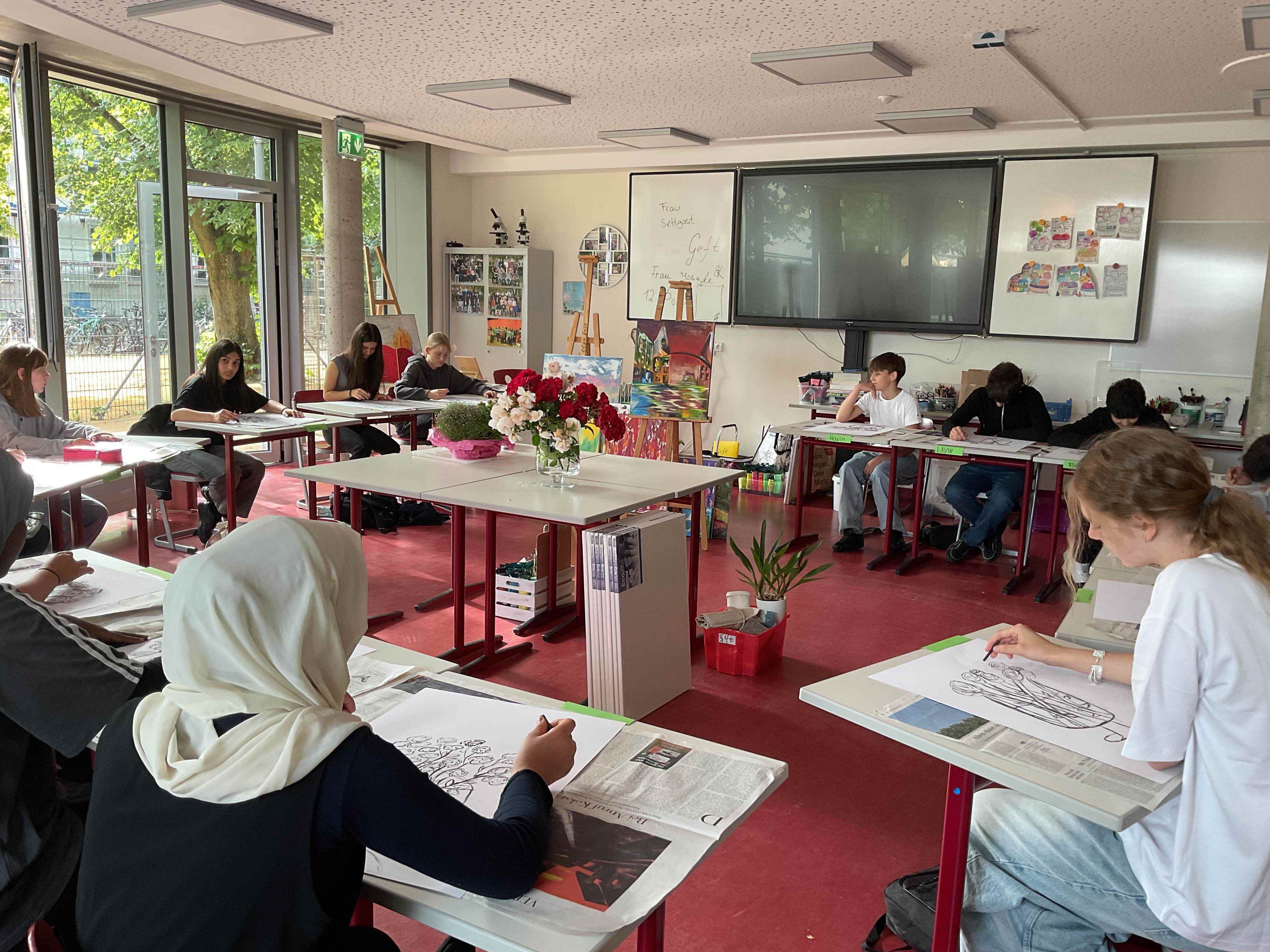 Das Projekt „Kunstwerkstatt: Fantasie", geleitet von Frau Geft, bezieht sich auf das Zeichnen und Malen. Alle Klassen dürfen daran teilnehmen. Zuerst wärmen sie sich mit Zeichenübungen auf. In der Woche lernen sie das Zeichnen mit Bleistiften, Kreide, Aquarellfarben und Acrylfarben kennen. Am Anfang zeigt Frau Geft, was die Schülerinnen und Schüler zeichnen sollen und am Ende dürfen sie ein Bild ihrer Wahl auf einer Leinwand malen.