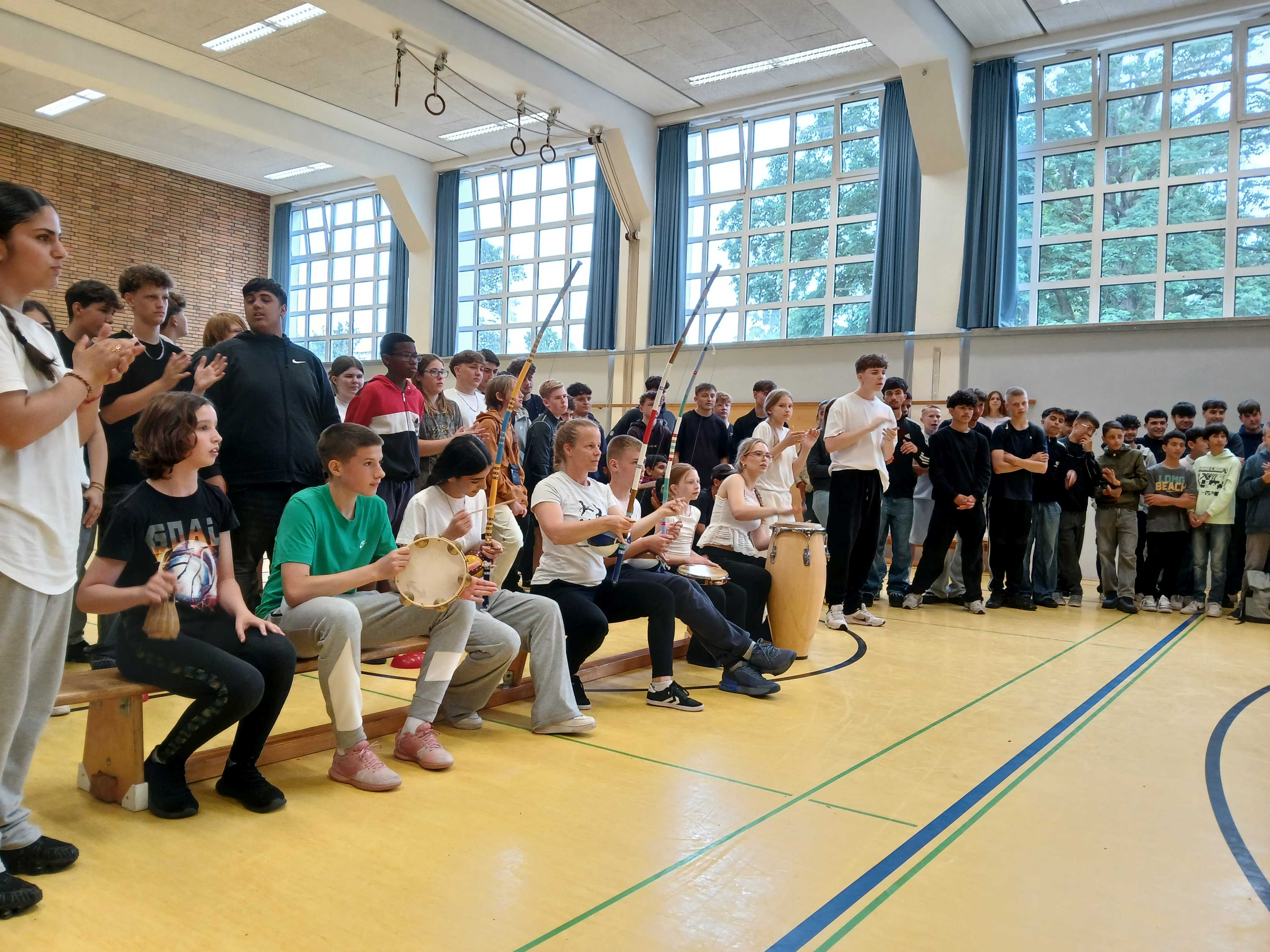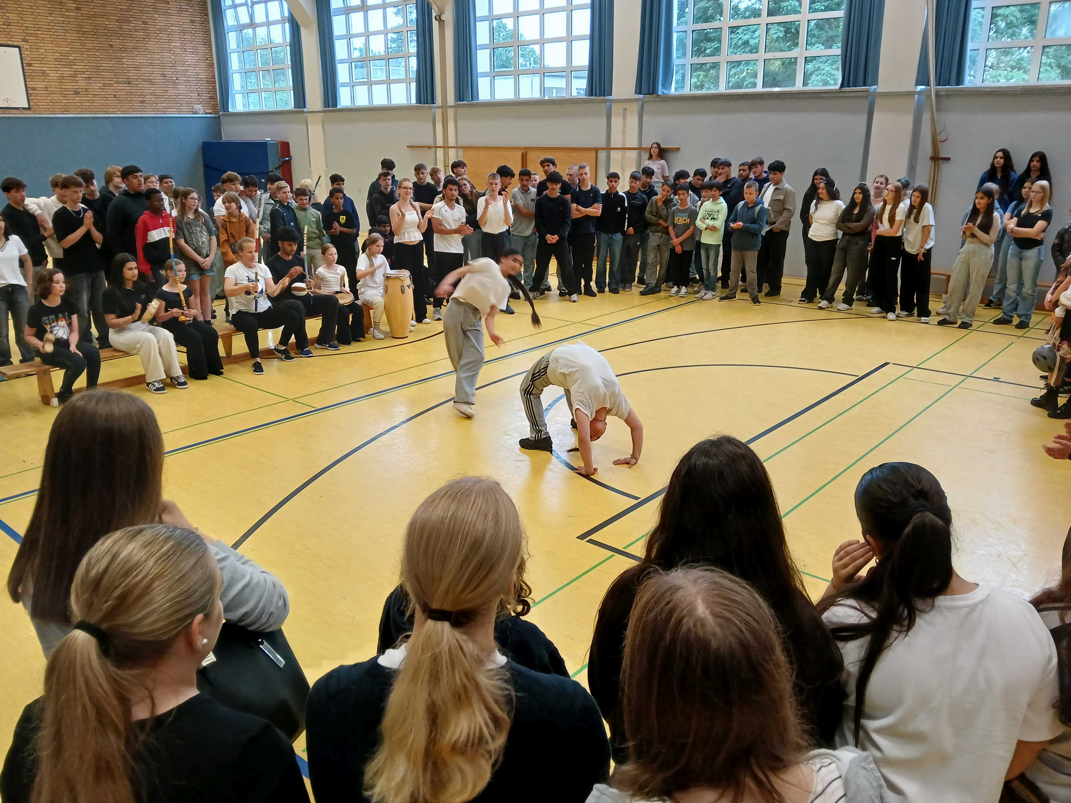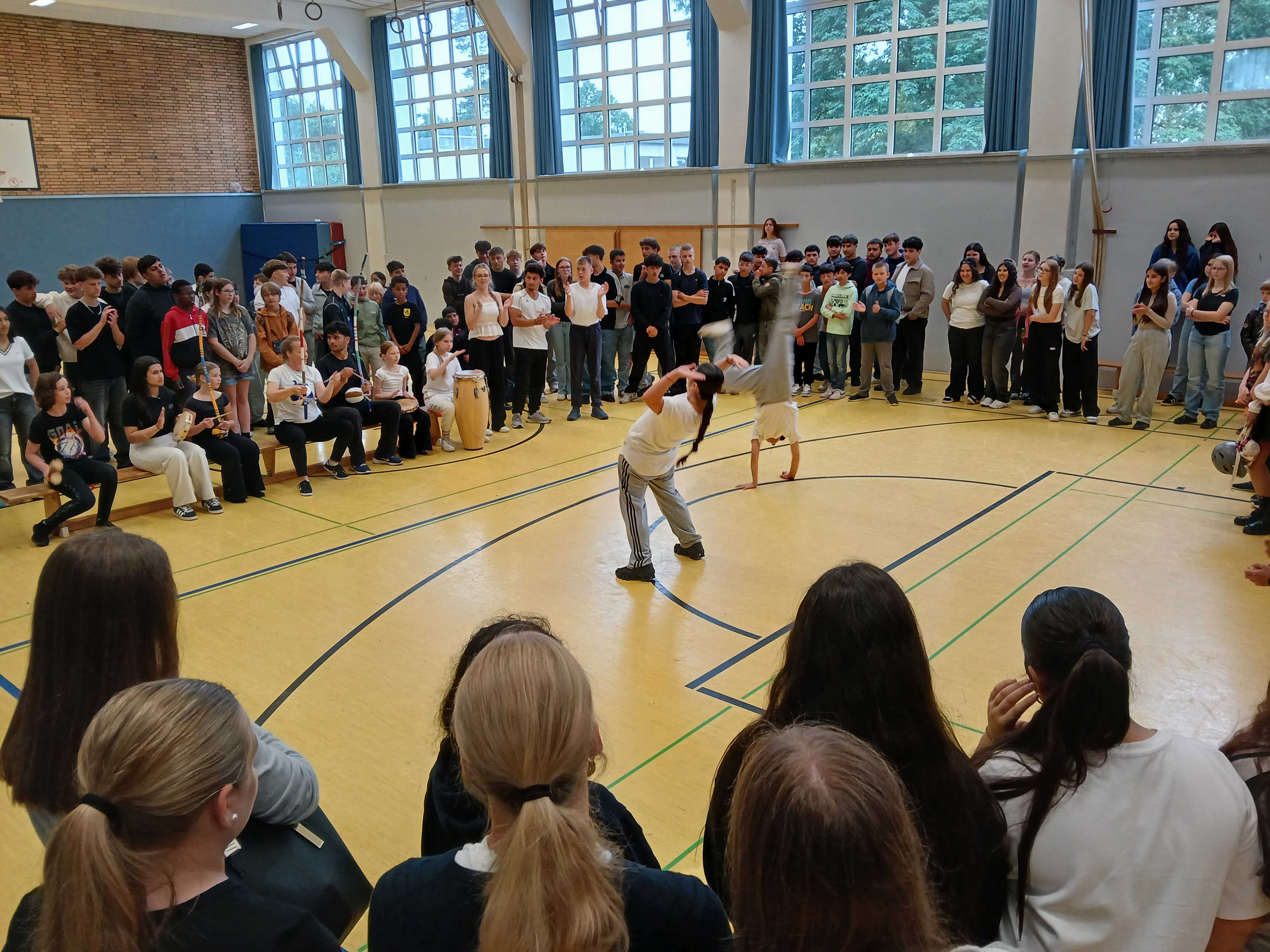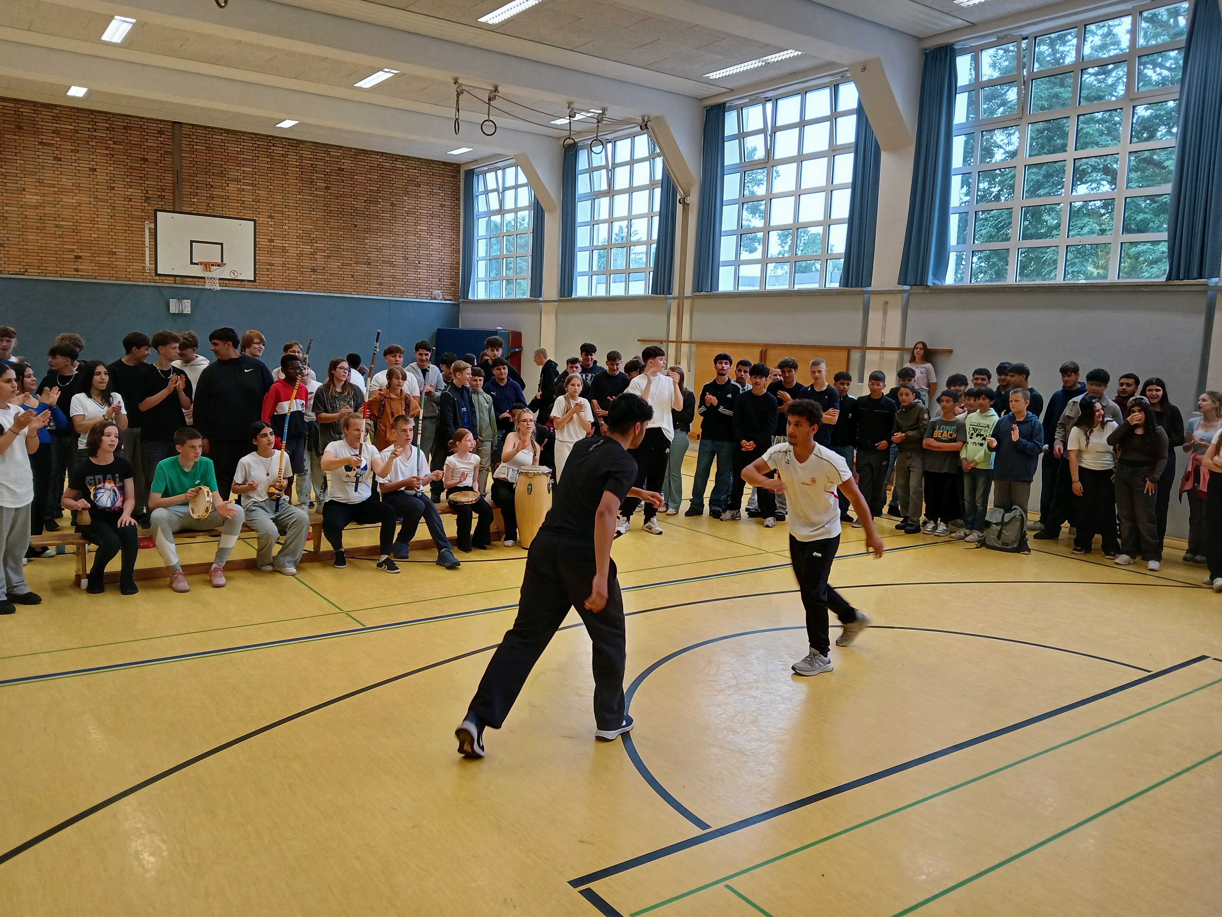 Das Projekt „Capoeira- Kampf, Tanz, Musik und Akrobatik“, geleitet von Frau Tiemann-Arsenic, bezieht sich auf den Brasilianischen Tanz-Kampfsport. Alle Klassen dürfen daran teilnehmen. Sie lernen die Capoeira-Tänze kennen, Abwehrübungen, Akrobatik und die typischen Musikinstrumente. Während sie das alles kennenlernen, wird den Schülern die Geschichte der Capoeira beigebracht. Am Ende der Woche bereiten sie eine Show vor und führen das Gelernte vor. Das Ziel für die Woche ist die Basics der Sportart zu wissen.